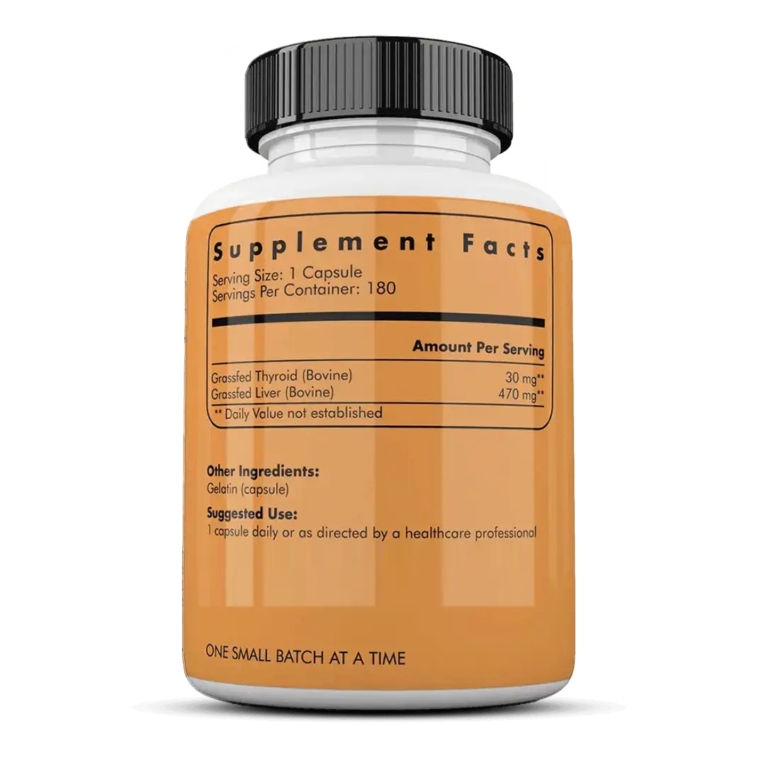 Whole food, nutrient-dense organs and glands can provide great benefit for those seeking targeted support in harmony with nature — the old-fashioned way, the way that our early ancestors did. Grass Fed Beef Thyroid is a whole food dietary supplement that provides natural desiccated thyroid (with liver). These whole foods provide the nutrients, proteins, peptides, cofactors and enzymes to nourish, balance and support thyroid health. The addition of liver fills nutrition gaps more completely than any other food (see thyroid nutrition below). Our mission is our purpose... putting back in, what the modern world has left out (to return people back to strength, health and happiness).